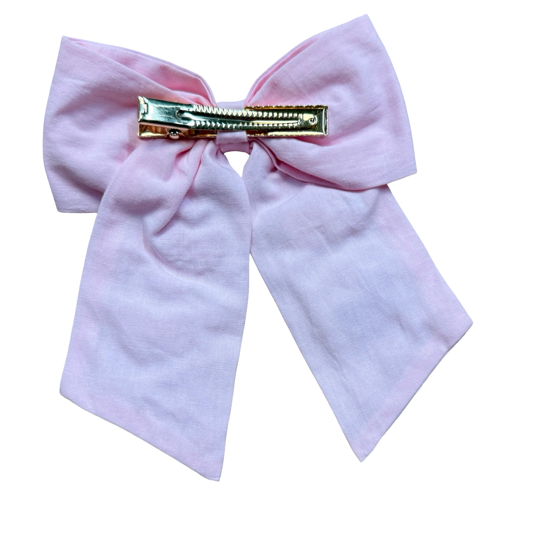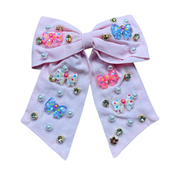 Excited to introduce our new bows! Our Bows on bow is made with lightpink fabric and adorned with charming bow charms. Designed with an alligator clip, it ensures easy on and off while providing comfortable wear all day. The addition of pearls and rhinestones gives it an extra sparkle, making it a perfect accessory for your back-to-school look. Elevate your style and step into the school year with confidence and flair!