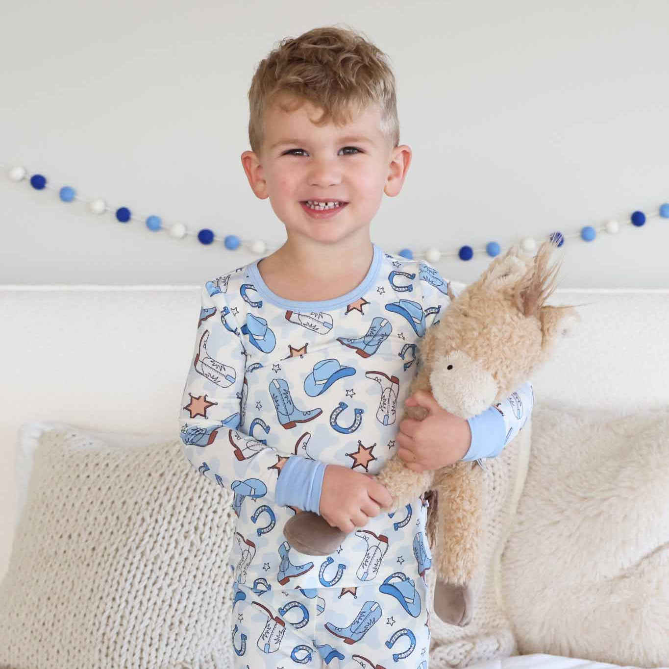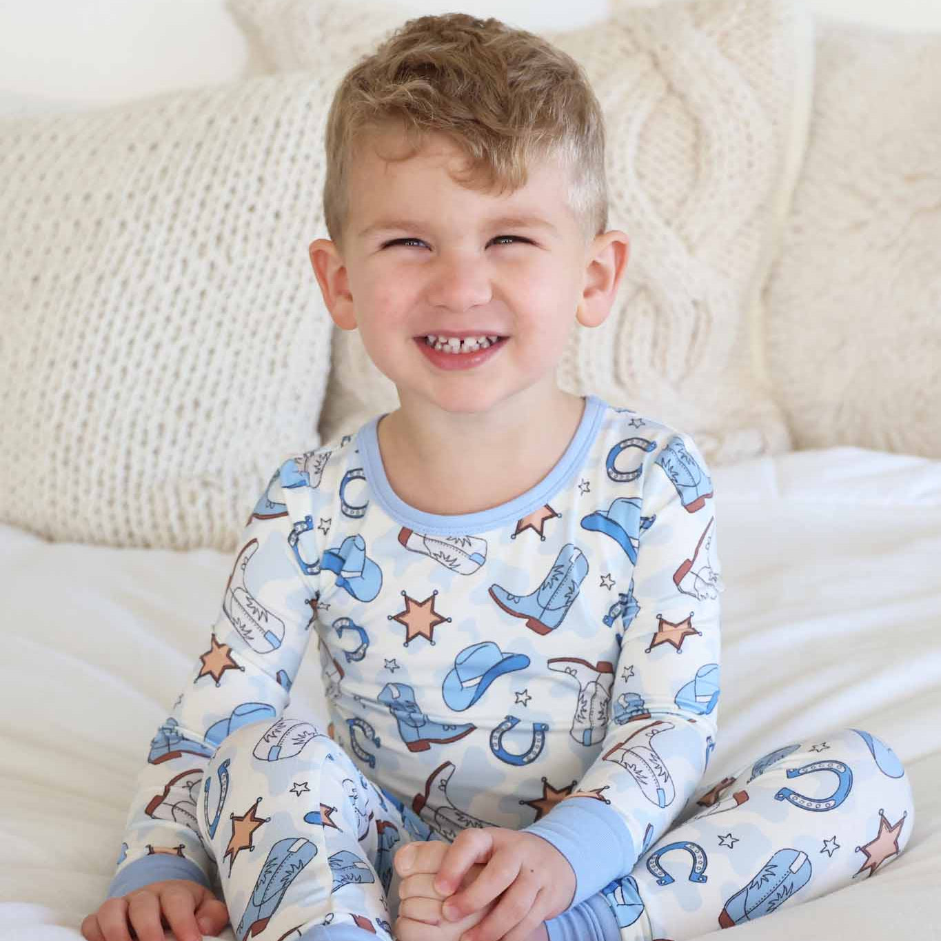 The Rodeo Dreams Two Piece Pajama Set is perfect for little cowboys who like a comfy fit with just the right amount of rodeo charm. Featuring cowboy boots, hats, lucky horseshoes, and sheriff stars in soft blue tones, these are the pajamas that every little cowboy will love wearing night after night. The long sleeve top and matching pants are soft and stretchy for easy movement, whether he’s winding down with a book or moseying into the kitchen for breakfast. Cozy enough for sleeping and comfortable enough for all-day lounging, this is one of those pajama sets that never get old.