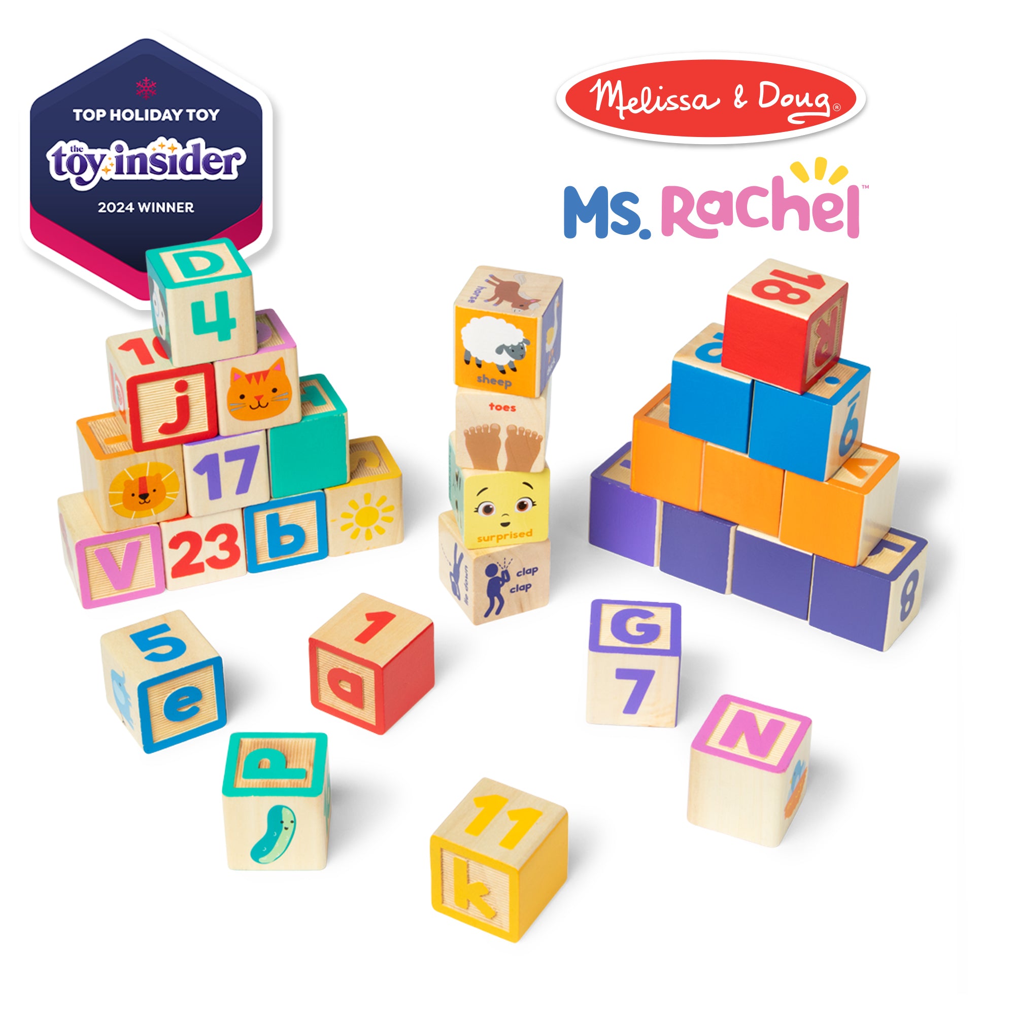 - Stack, match, roll, and learn with 30 wooden letter, number, picture, and activity learning blocks and 14 double-sided activity cards, inspired by educator Ms. Rachel’s popular baby and toddler videos