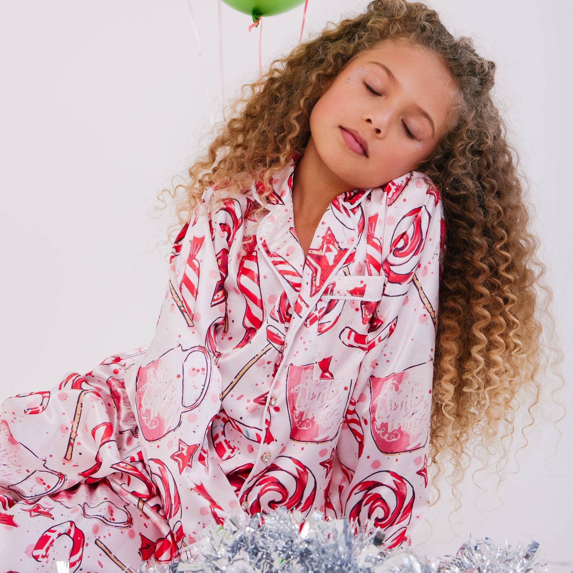• Celebrate the winter season with this festive silky set, featuring a delightful peppermint and candy cane pattern.