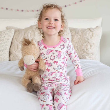 The Rodeo Dreams Two Piece Pajama Set in pink is made for little cowgirls who like their bedtime comfy with a touch of western charm. The playful print features pink boots, bows, lucky horseshoes, and dainty daisies that brings a girly touch to the classic western look. With a long sleeve top and matching pants, this set is soft and stretchy for easy movement, whether she’s winding down with a story, curled up for movie night, or moseying into the kitchen the next morning. Cozy enough for sleeping and cute enough for lounging, it’s the kind of pajama set that gets worn on repeat.