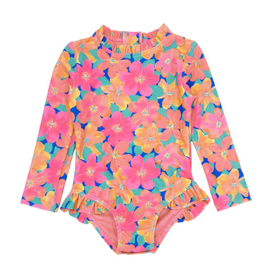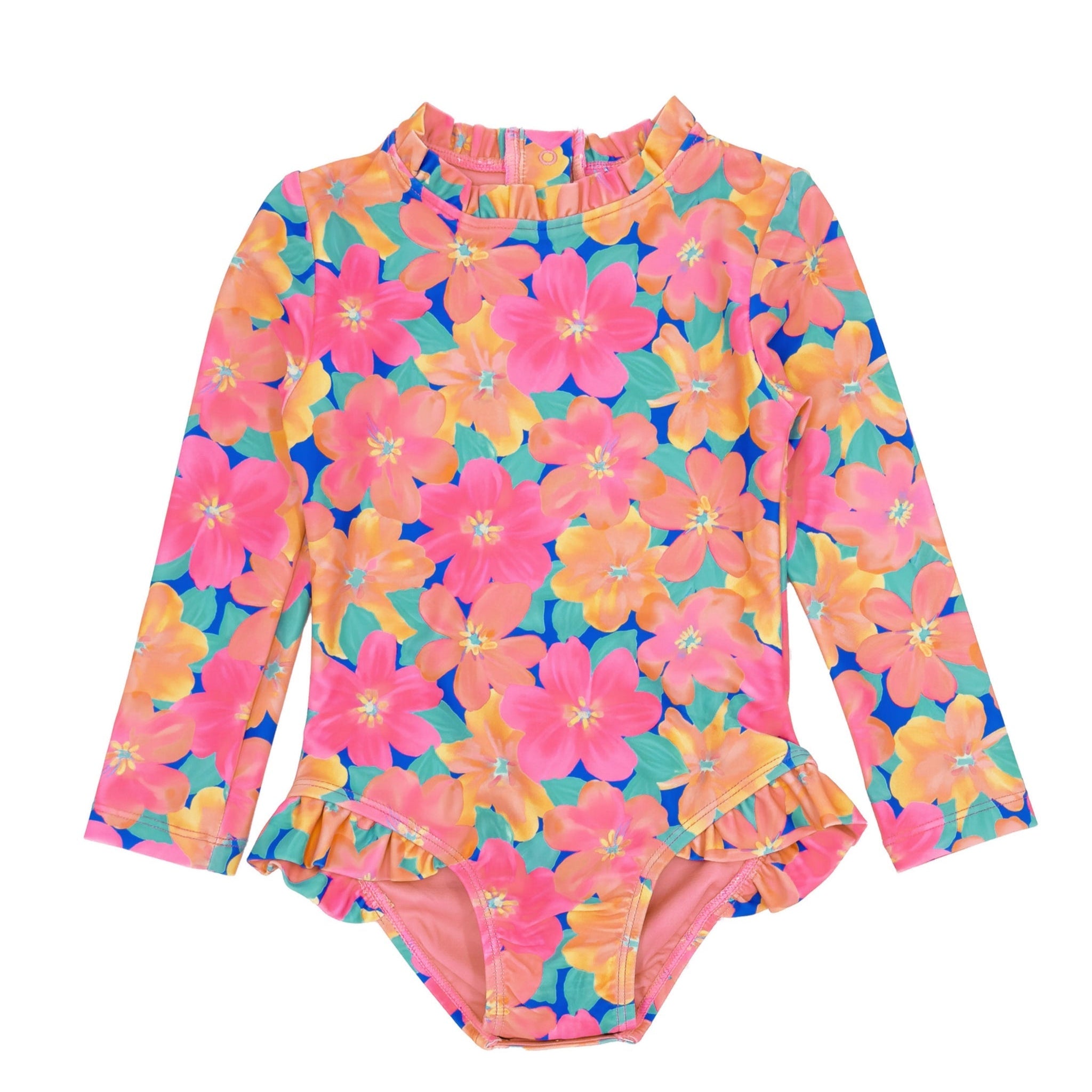 - Long sleeve swimsuit with ruffle detail at leg and neck opening, snaps included at bottom for easy diaper change
