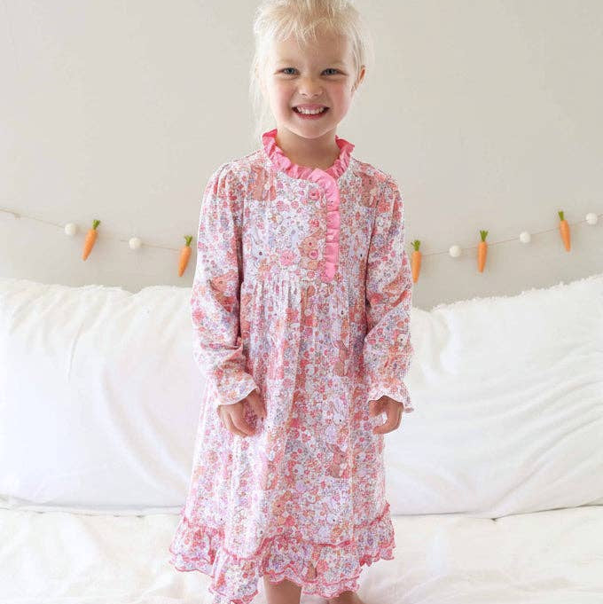 Hop into the sweetest bedtime look with our girl's Easter Nightgowns! These dreamy nightgowns are made from the softest fabric, ensuring your little bunny feels comfy and cozy all night long. Available in a variety of designs, these nightgowns will have every day feeling like a sunny spring morning. With long sleeves and ruffles, these nightgowns are designed to be the cutest festive look for any little girl whether she's waking up to an Easter morning surprise or simply enjoying a snuggly night in this Easter season.