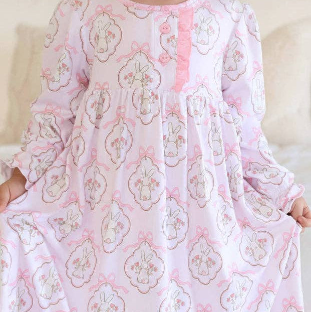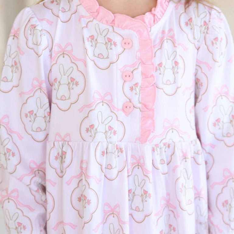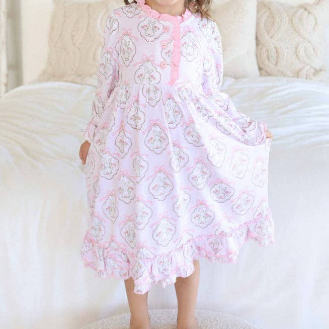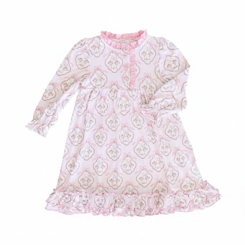 Hop into the sweetest bedtime look with our girl's Easter Nightgowns! These dreamy nightgowns are made from the softest fabric, ensuring your little bunny feels comfy and cozy all night long. Available in a variety of designs, these nightgowns will have every day feeling like a sunny spring morning. With long sleeves and ruffles, these nightgowns are designed to be the cutest festive look for any little girl whether she's waking up to an Easter morning surprise or simply enjoying a snuggly night in this Easter season.