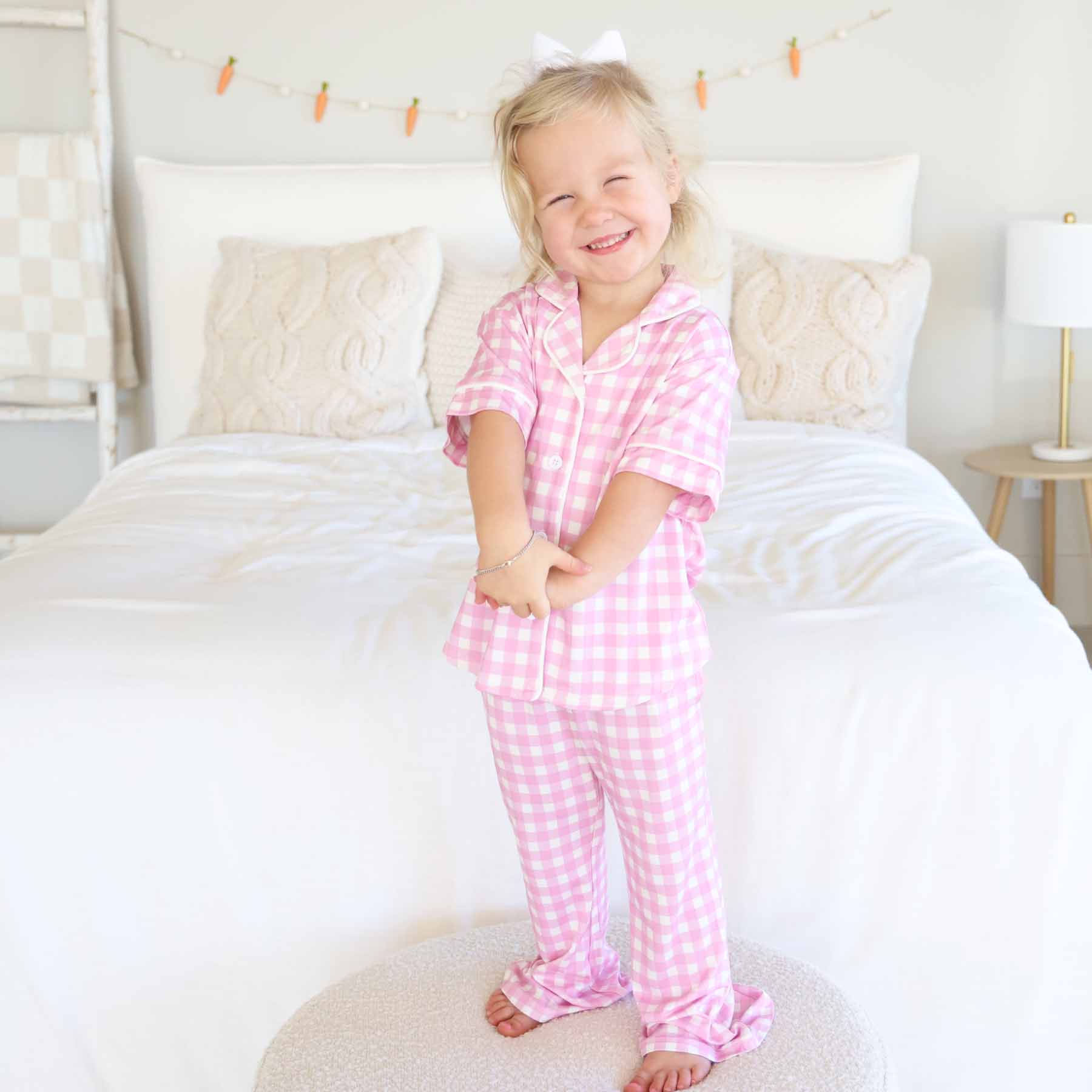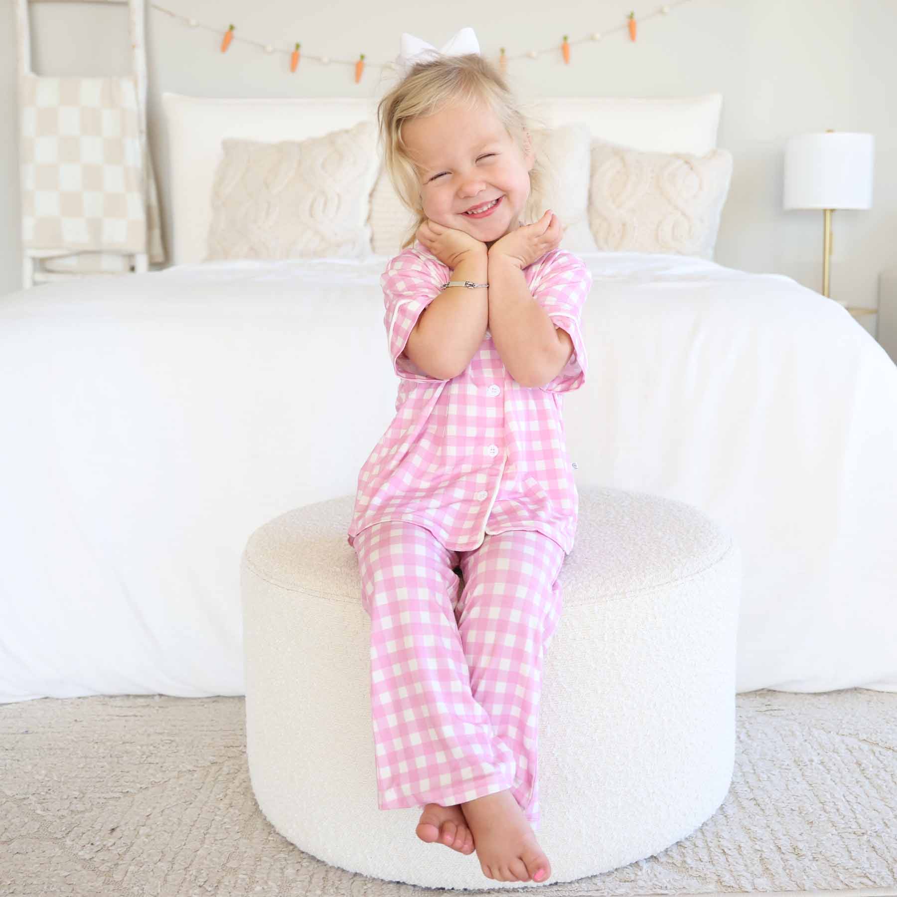 Spring days call for comfy sets with a little extra charm, and this gingham flare lounge set is just the thing! Designed in a classic gingham print for Easter and beyond, this short sleeve set is perfect for twirling, lounging, and matching with mom. Made from buttery-soft bamboo fabric, it’s lightweight, breathable, and gentle on sensitive skin. The relaxed top pairs effortlessly with the flared pants for a comfy fit that still feels special. Easy to wear and easy to love, it’s great for Easter morning, spring photos, and cozy days at home. Cute enough for special moments and comfortable enough for everyday wear, this set is sure to become a spring favorite!