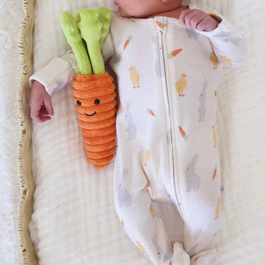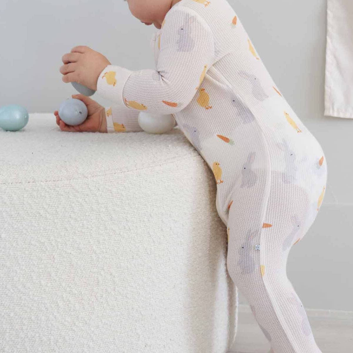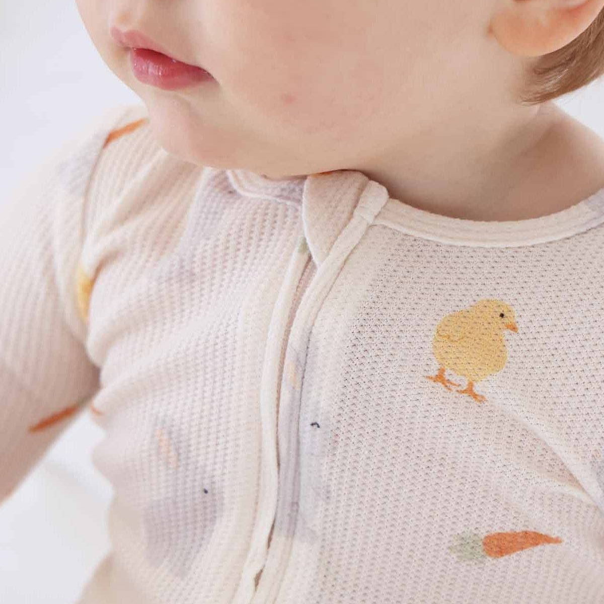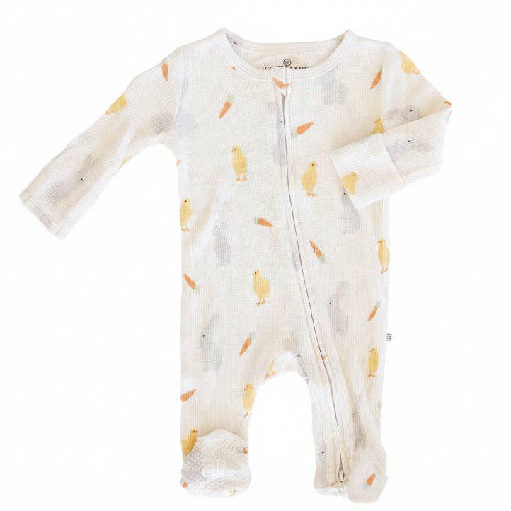 Sweet spring sleep starts here with the Sweet Peep Zipper Footie! Featuring the softest Easter print with gentle bunnies, fluffy chicks, and tiny carrots, this cozy one-piece is perfect for snuggly nights and slow spring mornings. Made from breathable bamboo waffle fabric, it has a lightweight, cozy feel that keeps little ones comfortable all night long. The full-length zipper makes changes quick and easy, while the footed design keeps tiny toes warm on cooler spring nights. Simple, soft, and easy to wear, this footie is made for everyday comfort with a festive Easter touch.
