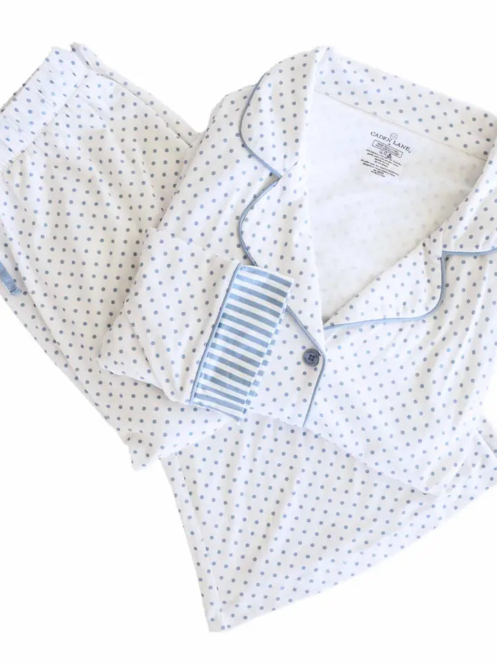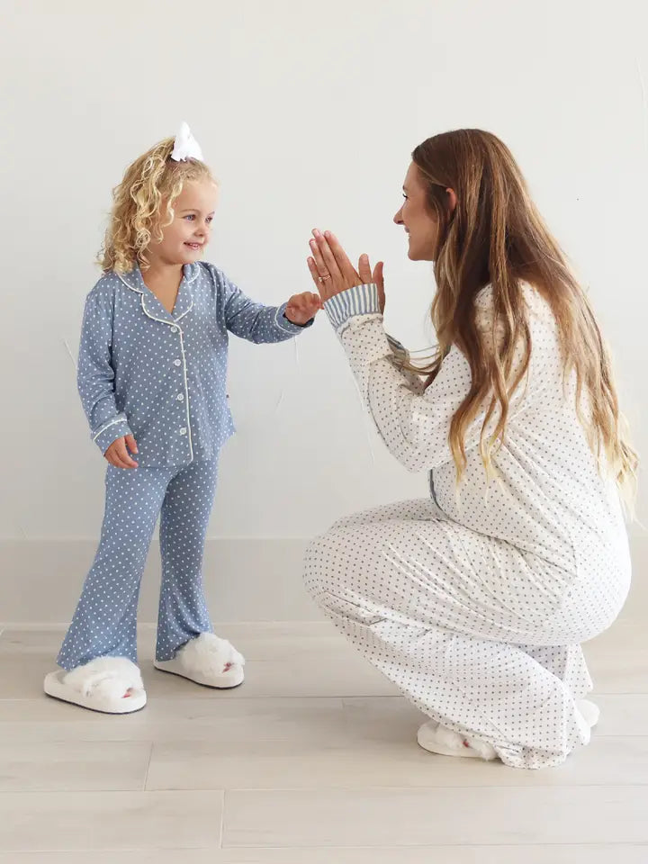 Elevated, cozy and coordinated, The Snuggle Spots Women’s Lounge Set is smooth, breathable, and lightweight for all-day comfort. Designed with a button-up top, classic collar, and relaxed flare pants in buttery soft bamboo viscose, this lounge set is the perfect balance of polished and comfortable. The white base with dusty blue spots gives this set a modern feel that pairs beautifully with your little one’s matching Snuggle Spots or Snuggle Stripes styles. Whether it’s a slow morning at home or a family lounge day, you and your minis can match in comfort and style.