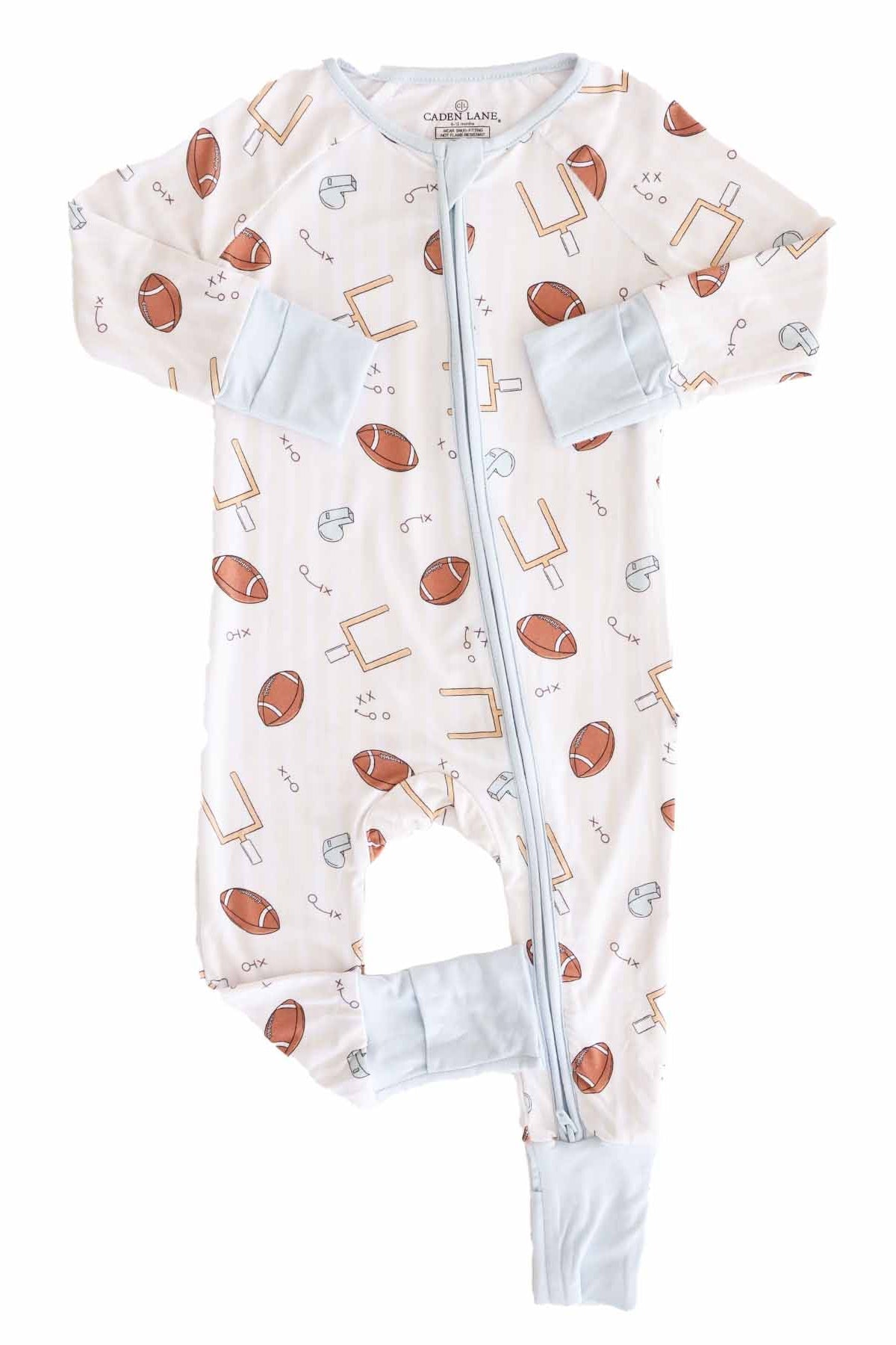 Made for tiny fans with big team spirit, our Tiny Touchdowns Convertible Zip Romper is a cozy staple for babies and toddlers. This sporty print features footballs, whistles and more on a soft striped background that brings the excitement of game day to your little one’s everyday routine. Crafted from a breathable bamboo blend that’s soft and stretchy, this romper is designed with a convertible footie style that easily switches from footed to footless, while the two-way zipper makes changes quick and easy. Available in both neutral and pink versions for perfect sibling or cousin matching, this pajama romper will be your game day go-to this football season!