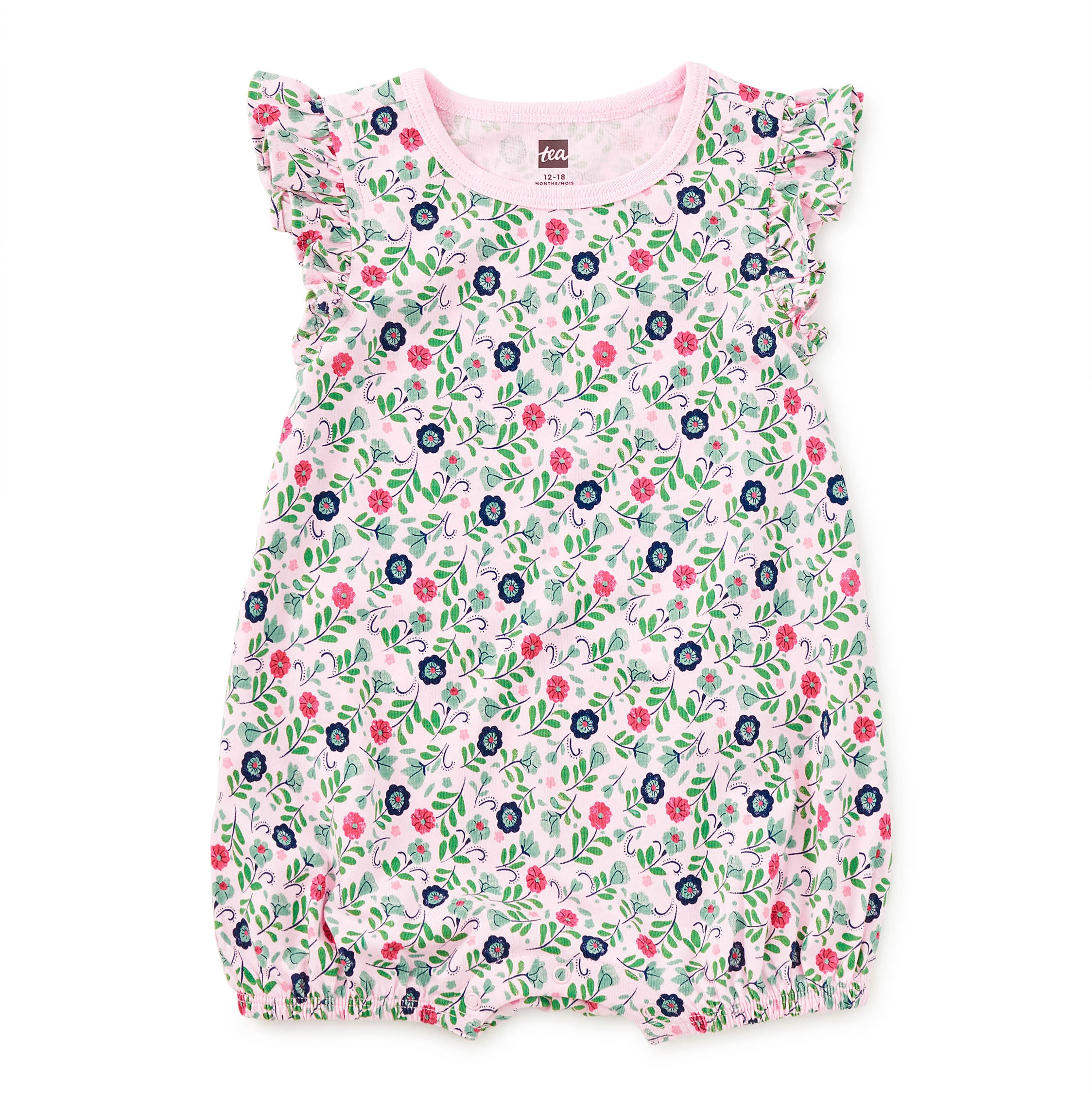 Sweet details meet everyday ease. This flutter-sleeve romper features an artist-designed floral print that adds charm to a one-and-done outfit made for tiny adventures. Thoughtfully designed for comfort and convenience, it's crafted from soft 100% cotton jersey with snaps at the inseam for easy diaper changes and elastic leg openings for a gentle, flexible fit. Made to be worn often, washed well, and passed along when the time comes. Perfect on its own or as part of a coordinated look with matching styles for siblings.