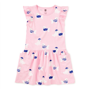 A cheerful favorite designed for everyday play. This Flutter Sleeve Pocket Dress features an artist-drawn Spanish Water Dog print, created in-house to bring a joyful, character-filled feel to everyday dressing. Thoughtfully made for comfort and movement, it's designed to be worn often, washed well, and loved long enough to pass along. Crafted of soft 100% cotton jersey, it features flutter sleeves, a gently gathered skirt, and side patch pockets for collecting small treasures.