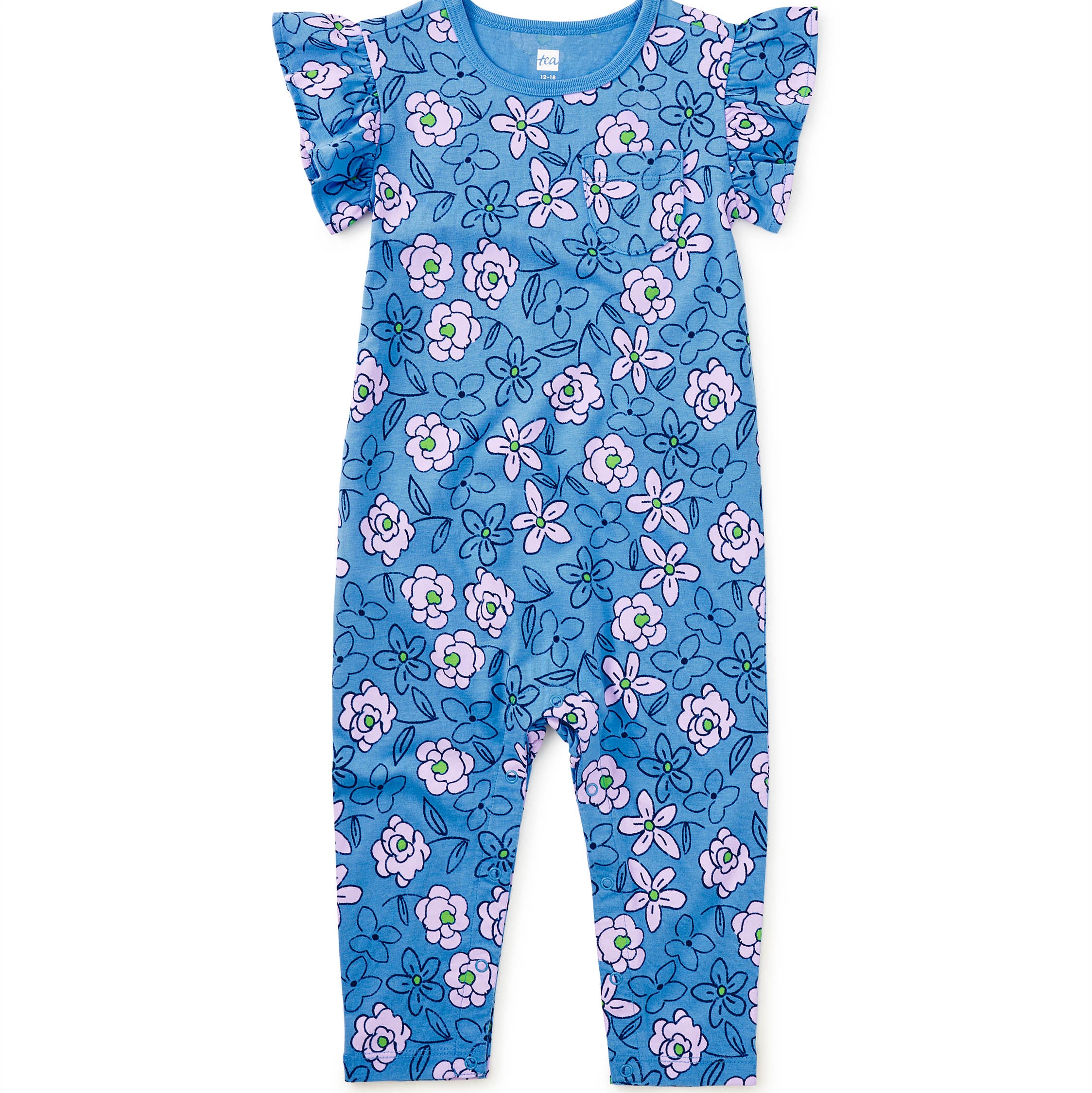 An easy, all-in-one favorite with sweet details throughout. This full-length romper features an artist-designed floral print and soft ruffle sleeves, finished with a front patch pocket for extra charm. Crafted from soft 100% cotton jersey, it's designed with snaps at the inseam for quick diaper changes and a comfortable fit that moves with baby from playtime to nap time. Made to be worn often, washed well, and loved long enough to be passed along.