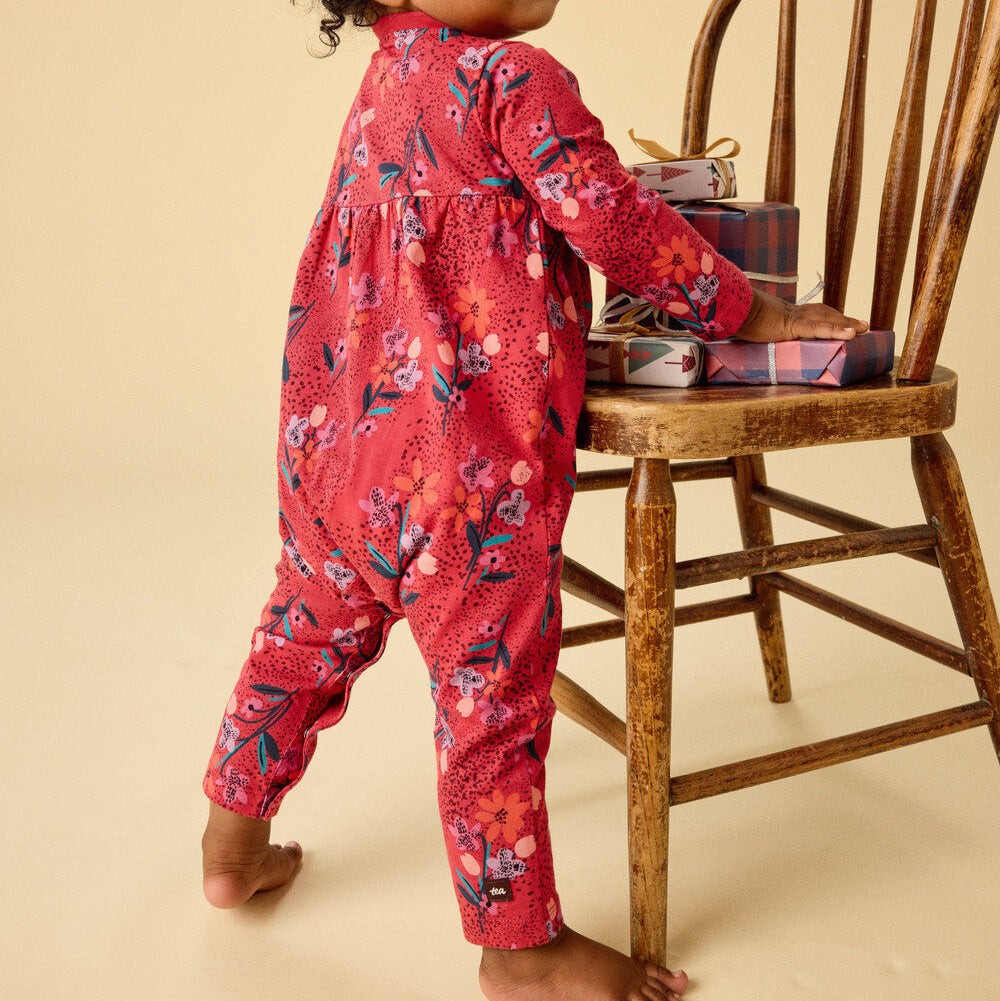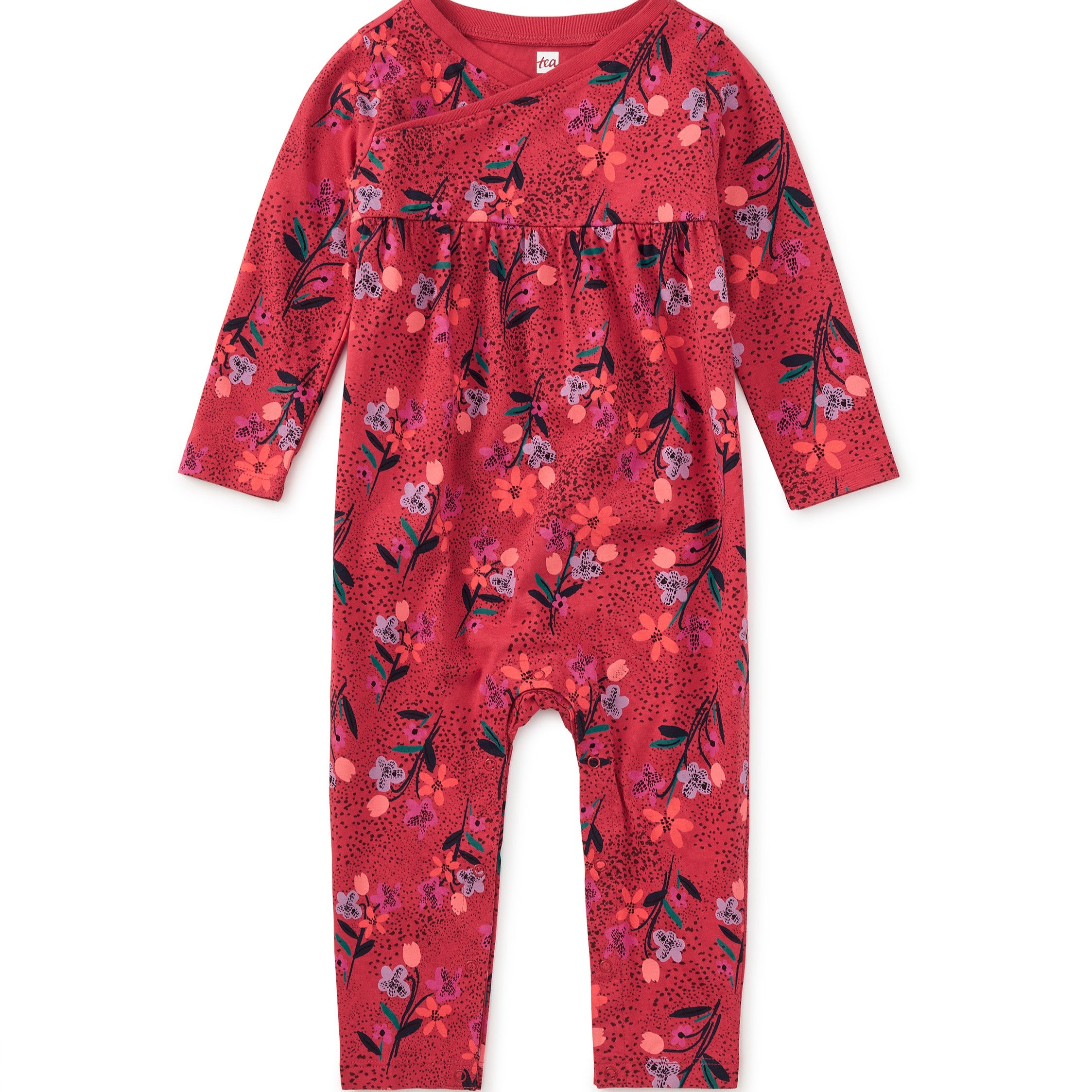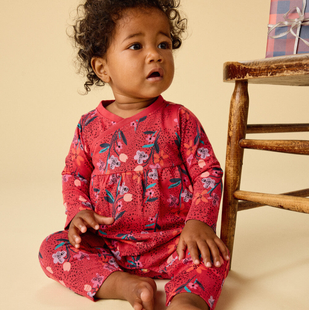 A darling choice for new arrivals, this romper is as sweet as it is practical. The empire waist and wrap v-neck add charming detail, while the allover floral print makes it picture-perfect for special moments or everyday cuddles. Thoughtfully crafted in soft 100% cotton jersey, it's gentle on baby's skin and features snaps at the inseam for easy changes. A lovely pick for expectant parents or a gift that will be cherished.