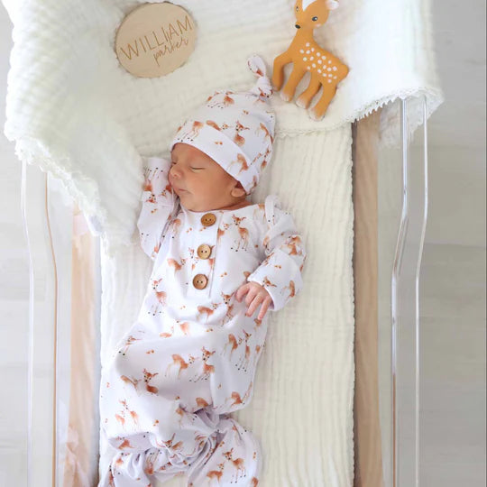 Welcome your baby home in the gentle warmth of our Friendly Fawns Knot Gown and Hat Set! Covered in a sweet woodland print with soft fawns and tiny mushrooms, this outfit brings calm, cozy charm to those precious first days. Made from soft, breathable fabric with just the right amount of stretch, the gown features fold-over cuffs and an adjustable tie bottom for easy diaper changes, while the matching knotted hat completes the look and keeps your newborn snug from head to toe!