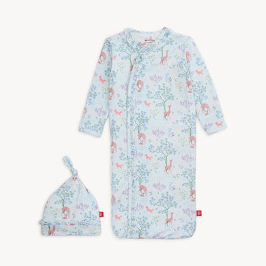 Our modal Gown & Hat Set is a newborn, late-night must-have. Magnets take diaper changes to a new level of fuss-free efficiency, while a closed bottom keeps toes and feet warm and cozy—which is mission critical during your third middle-of-the-night change. Other amazing features include the silkiest, softest modal fabric and built-in mitten cuffs.