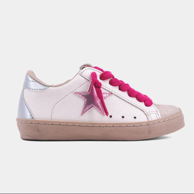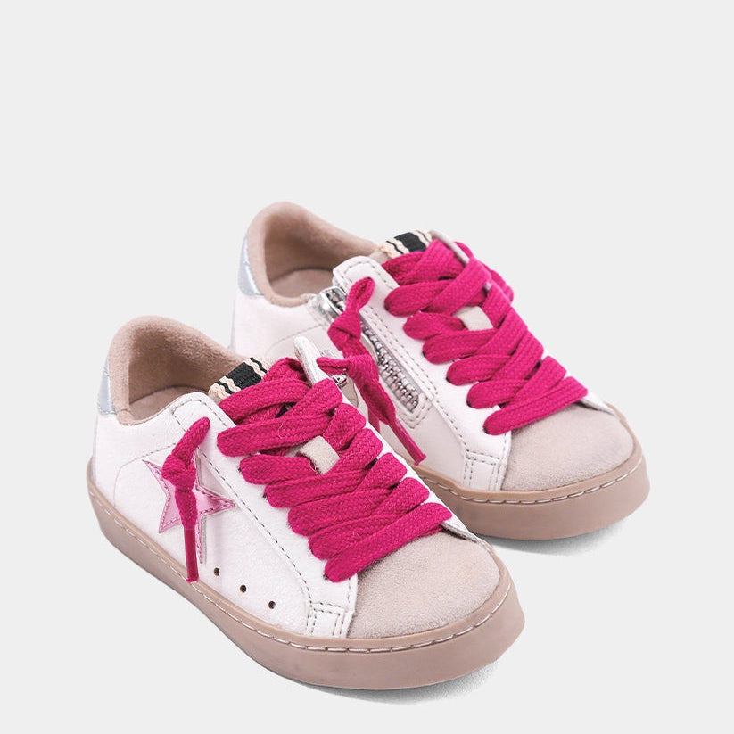 A tiny sneaker with a big attitude, the PAULA MINI in Metallic Light Pink brings bold contrast to everyday outfits with its soft pink metallic star, purple laces, and shiny lilac heel tab. This playful sneaker is built with faux leather and suede-like textures, making getting dressed fun for little trendsetters. Toddler sizes feature an easy-on side zipper for stress-free mornings.