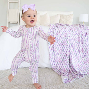 Bloom into cozy days and dreamy nights with our Lila’s Lilacs Convertible Zip Romper! Featuring delicate roses on rustic lilac stripes, this floral design is as timeless as it is comfy. Made from breathable bamboo waffle fabric, the romper is soft against baby’s skin with just the right amount of stretch for every wiggle. A two-way zipper makes changes quick and simple, while convertible feet let you switch from playtime to sleepy snuggles in seconds. Perfect for everyday wear or photo-ready moments, this romper is a beautiful blend of comfort and style.