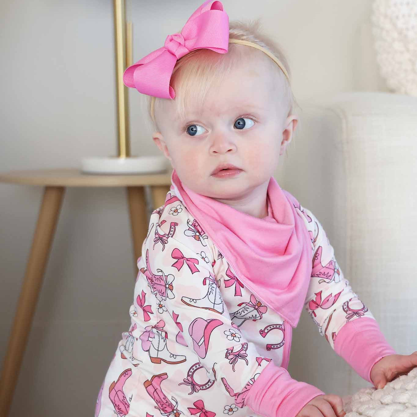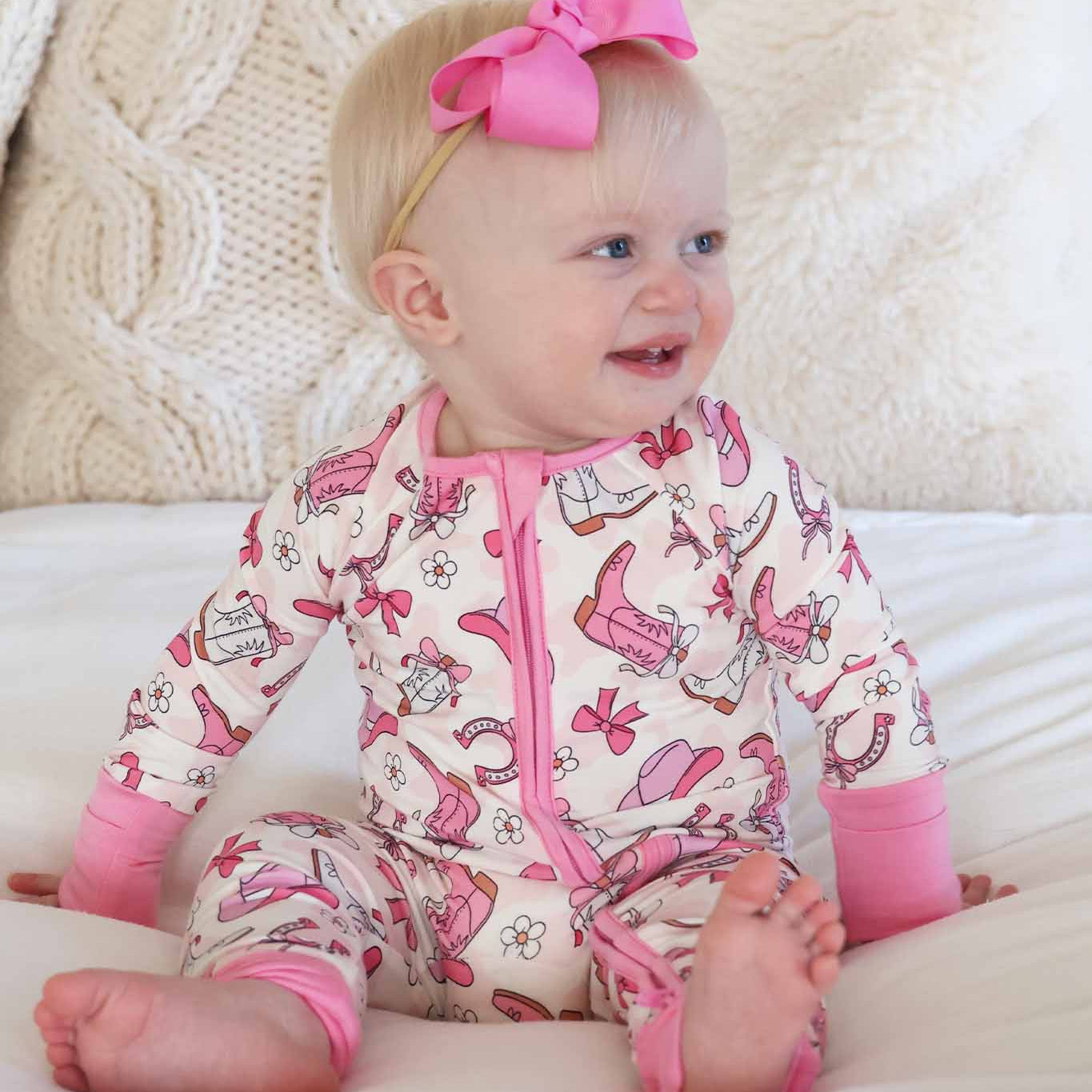 Cute, cozy, and ready for every little rodeo dream! The Rodeo Dreams Convertible Zip Romper for girls is made for snuggles, playtime, and all the sweet moments in between. Covered in the prettiest pink western print with boots, bows, lucky horseshoes, and daisies, it’s the kind of outfit that makes even bedtime feel extra special. The full-length zipper makes changes quick and painless, and the convertible fold-over feet let you switch from footed to barefoot in seconds. Keep her toes warm for naps and nighttime, then flip them open for daytime play and tiny wiggles. Soft and stretchy for all-day comfort, this romper is perfect for lounging at home, stroller rides, and matching moments you’ll want to capture forever.