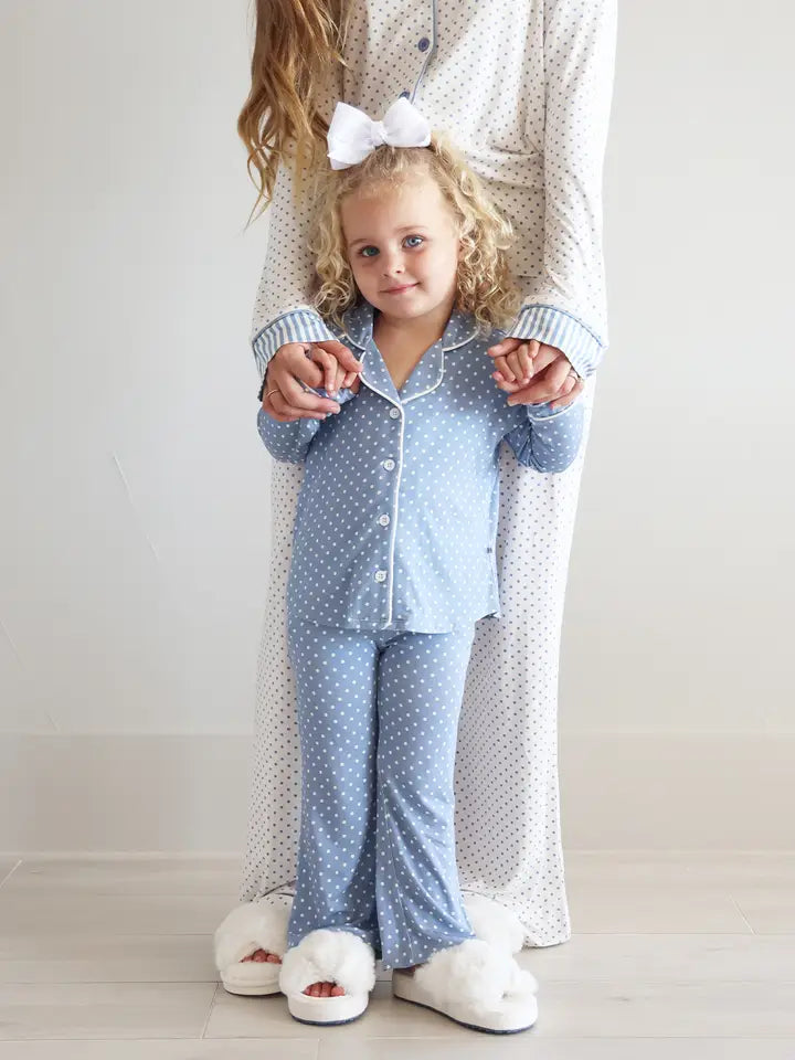 Soft, stylish, and made for matching with mom, the Snuggle Spots Girl’s Lounge Set is giving little ones the comfort they deserve with the style moms love. Crafted from buttery soft bamboo viscose with a button-up top and collar with relaxed flare pants, this set brings the perfect blend of cozy and cute. The dusty blue base with white spots adds a playful twist that coordinates perfectly with mom’s matching set or brother’s Snuggle Stripes pajamas. Whether it’s a cozy morning at home or a matching moment that’s oh-so cute, this lounge set was made for everyday comfort.