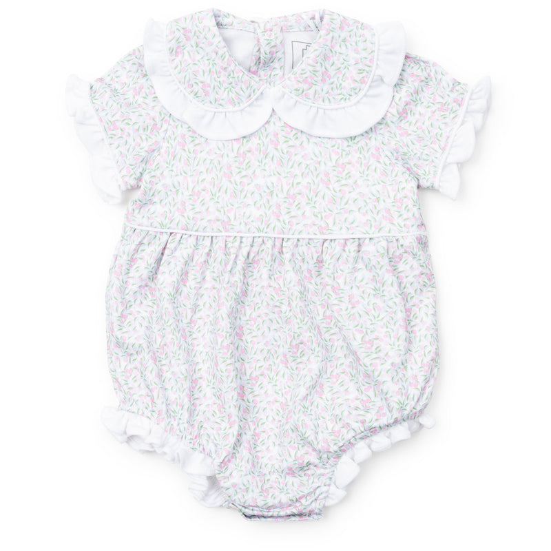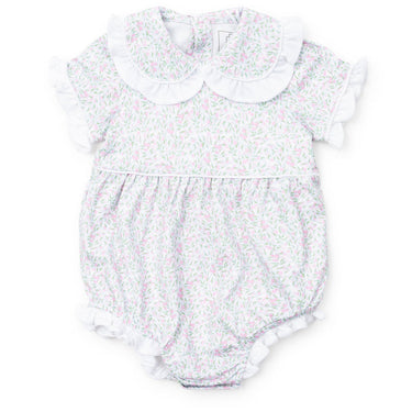 Girls' ruffled peter pan collar short sleeve pima bubble. Button closure in back and three snaps in the stride. Made from 100% Peruvian Cotton.