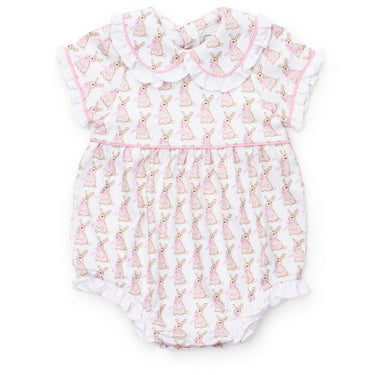 Girls' ruffled peter pan collar short sleeve pima bubble. Button closure in back and three snaps in the stride. Made from 100% Peruvian Cotton.