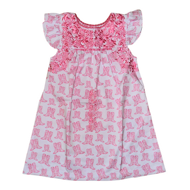 Saddle up for style with our Pink Cowboy Boots Dress! This dress features playful flutter sleeves and beautiful pink embroidery. Perfect for the rodeo, country concerts, or any occasion where you want to kick up your heels!