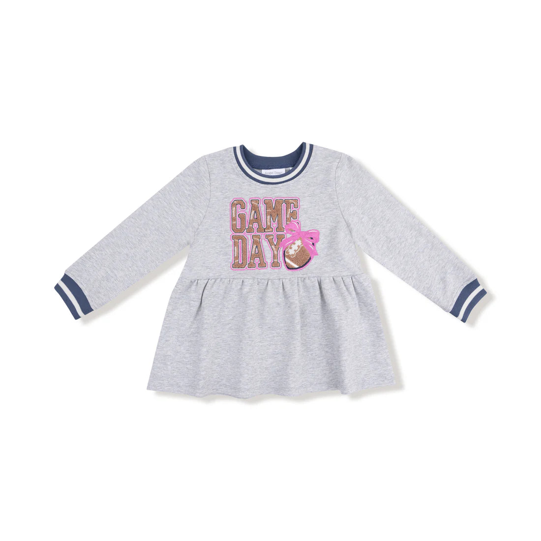 Score style points with our cozy Drop Waist Dress, made from soft French Terry and featuring a cute chenille “Game Day” football applique complete with a sweet bow. Perfect for little fans who want to cheer in comfort and charm, this dress offers a relaxed fit that’s great for layering and all-day play.