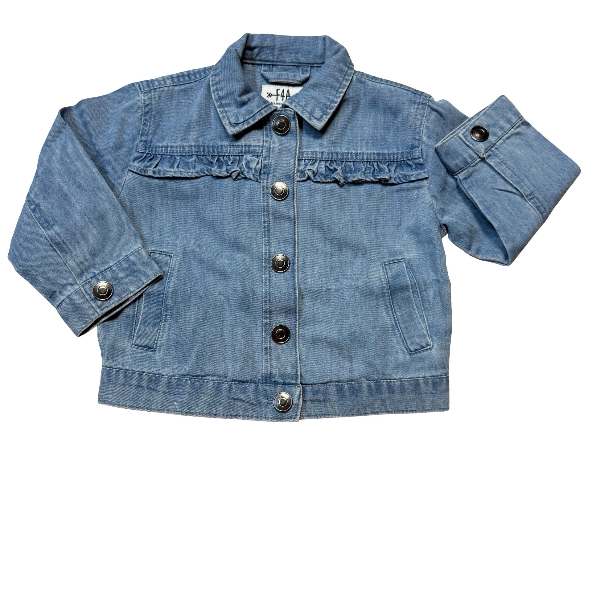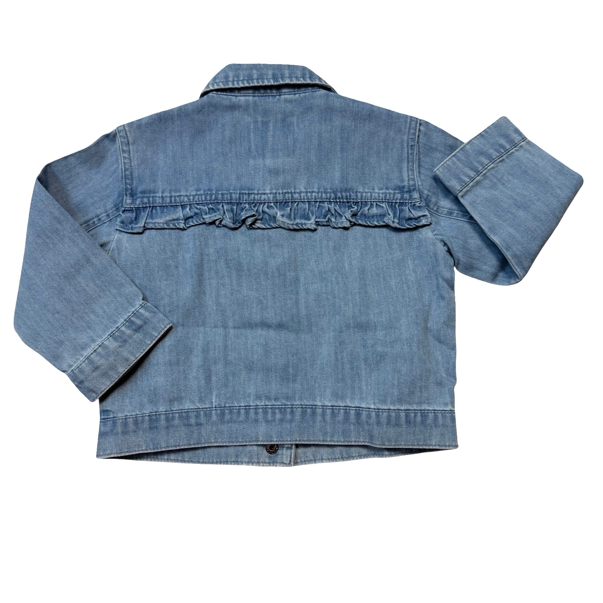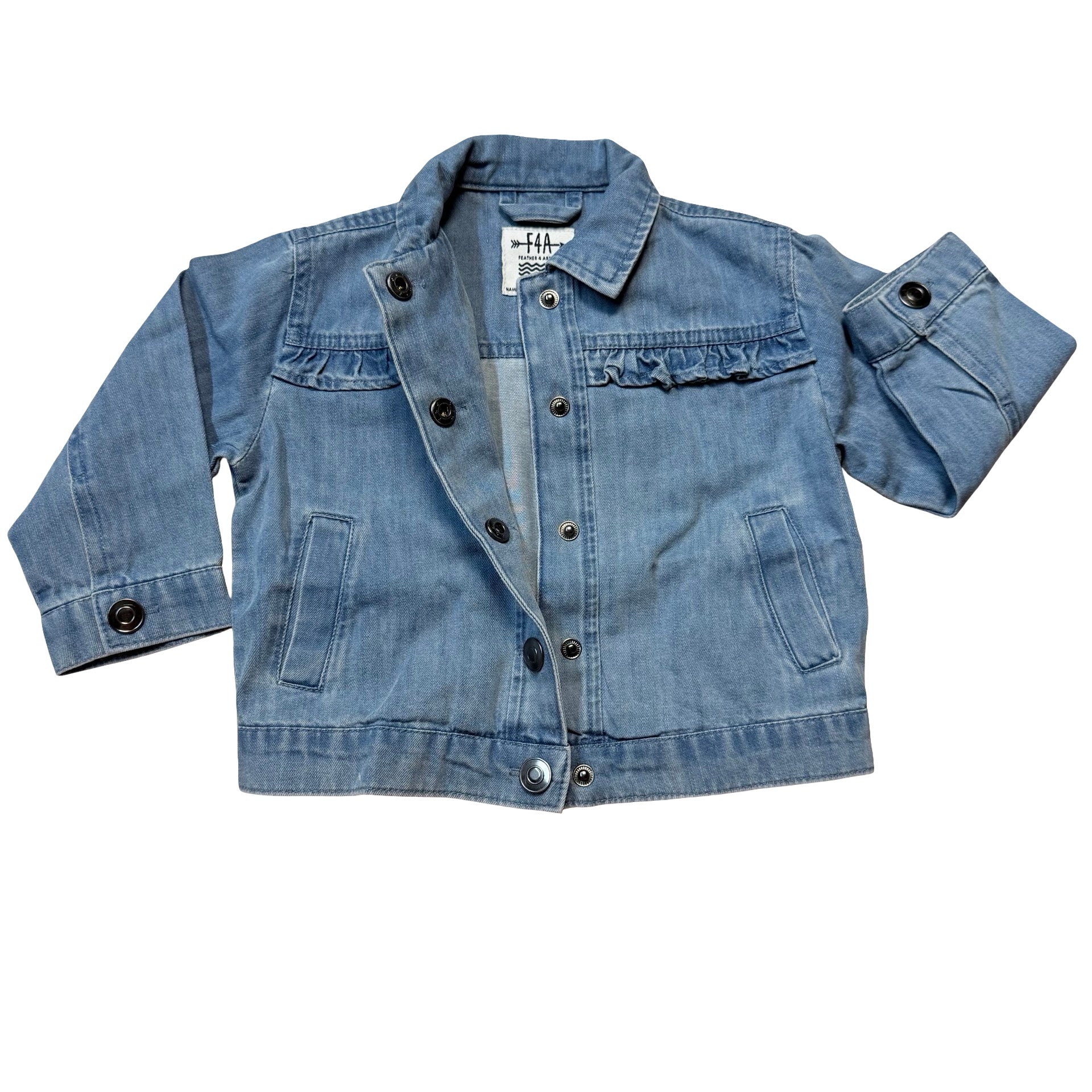 This lightweight denim jacket is the perfect way to carry your girl's dresses into fall, or just to add an extra cute touch to any outfit! The ruffled details, and the snap buttons make this the perfect denim for your little girl!