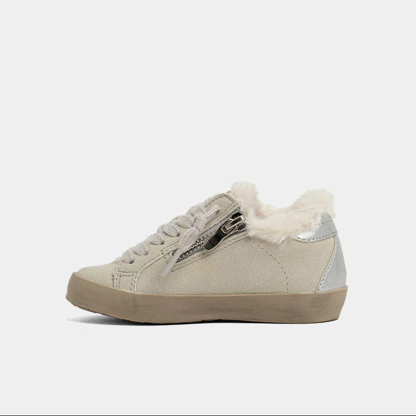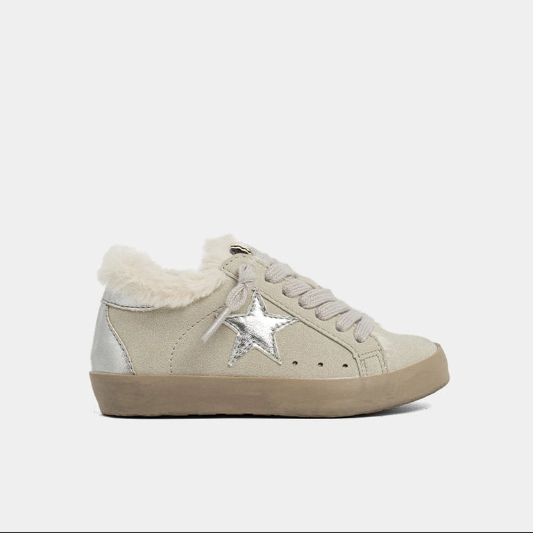 A cozy twist on a SHUSHOP favorite-PAULA MINI in Light Grey Suede is made to shine (and stay warm). This kids’ version of our iconic sneaker features a soft faux suede upper in light grey, finished with a subtle metallic star and silver heel tab. The plush faux shearling lining adds both comfort and seasonal flair, making it a must-have for cooler days. Stylish, snuggly, and made to move-just like her.