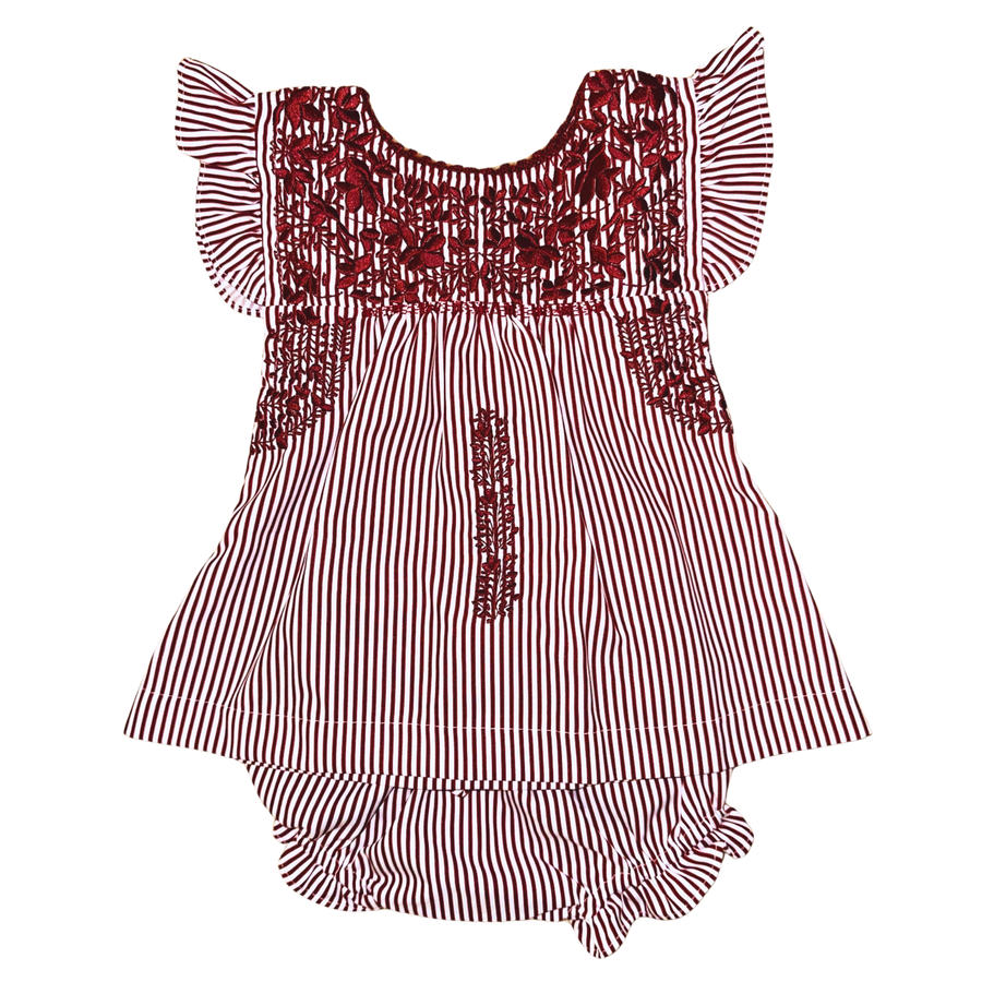Outfit your baby in playful flutter sleeves, maroon embroidery, and matching ruffle bloomers.