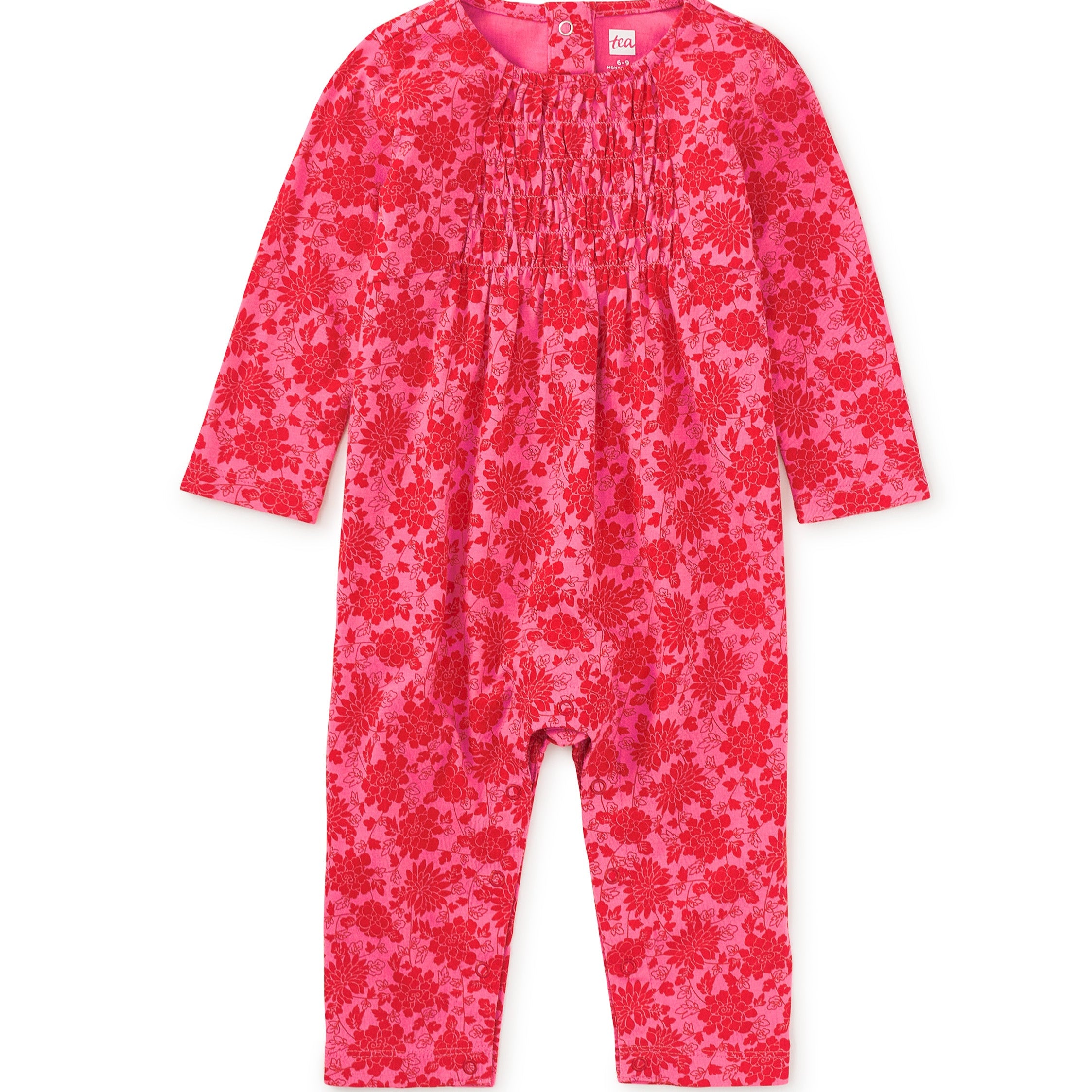 Sweet smocking, allover blooms, and soft cotton jersey make this romper a little charmer. Easy back and inseam snaps mean faster changes and more playtime. Comfy enough for tummy time, cute enough for outings--a favorite for every day.