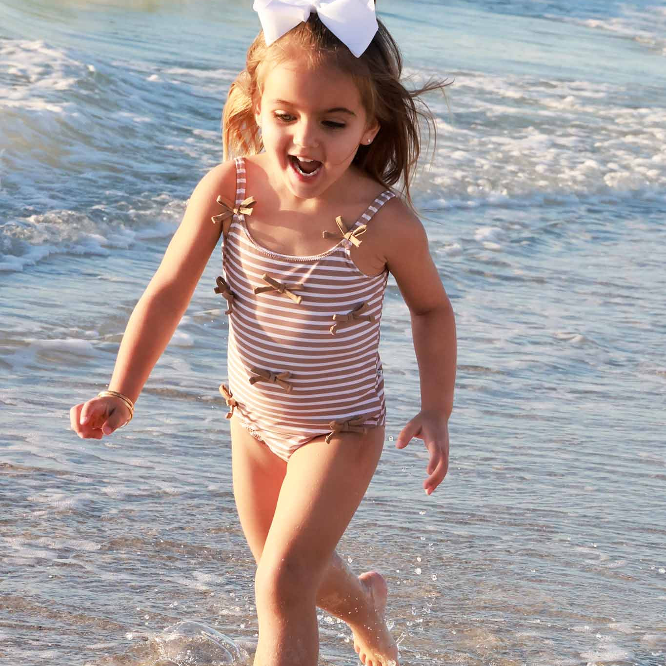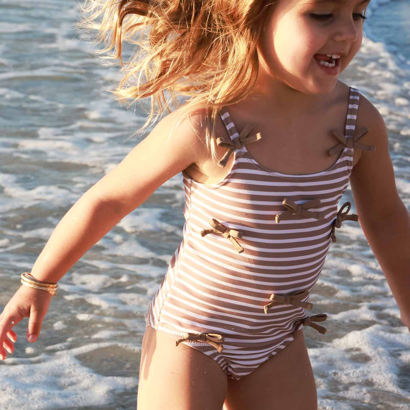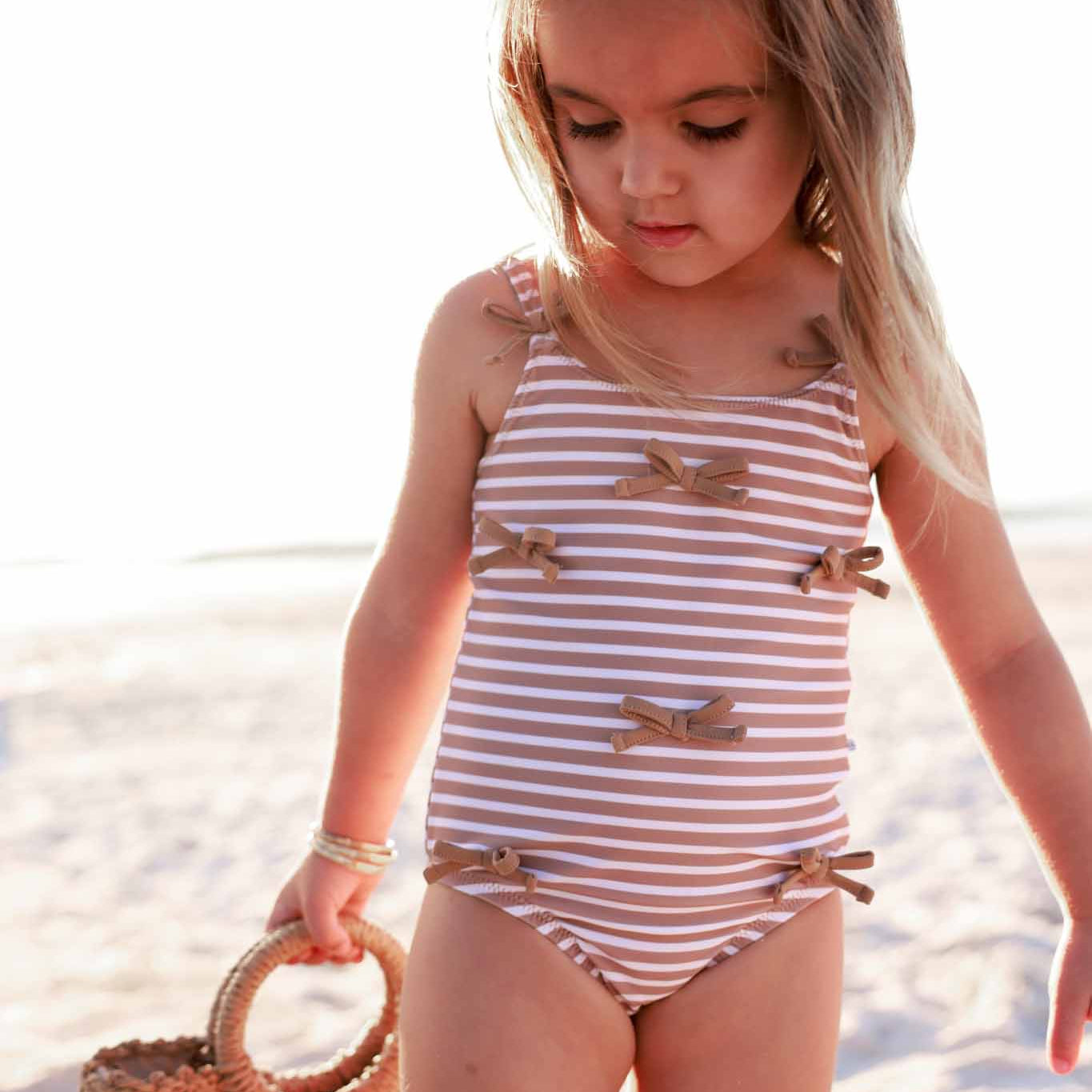 Details: *80% Nylon, 20% Spandex *UPF 50+ sun-protection *Blocks 98% the sun’s harmful UVA & UVB rays for maximum sun defense *Quick-drying, sun and chlorine resistant fabric *Flat lay seams *Easy diaper access snaps on smaller sizes up to 2T *All-way stretch for maximum comfort with or without a swim diaper *Tagless for comfort Care Instructions: *Gentle wash cold with like colors *Tumble dry low *Do not bleach This swimsuit is sweet, simple, and made for sunny little moments. The Sandy Stripes Tiny Bows One Piece is part of our family matching swim collection, and features clean neutral stripes for a timeless beachy look. Finished with delicate bow details throughout, it adds just the right amount of pop while still staying neutral. Designed with comfort and convenience in mind, this one-piece includes snap bottoms for easy changes, making it a great option for little ones on their potty training journey.