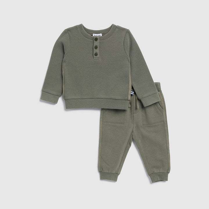 Made for movement and mischief, our Adventure Thermal Jogger Set is a cozy essential for your little guy's cool-weather wardrobe. The set includes a textured thermal henley top with contrast buttons and comfy olive green joggers with roomy patch pockets.