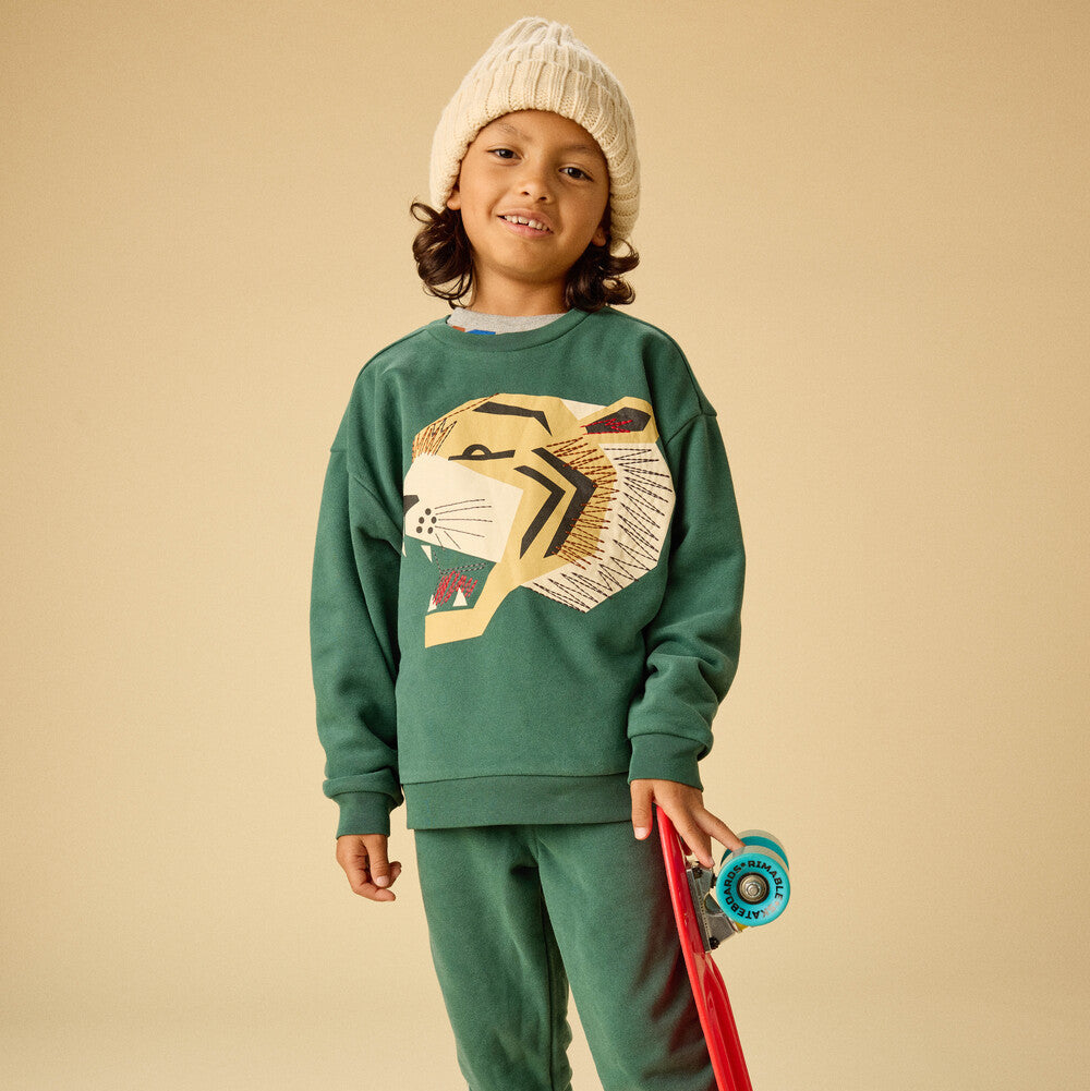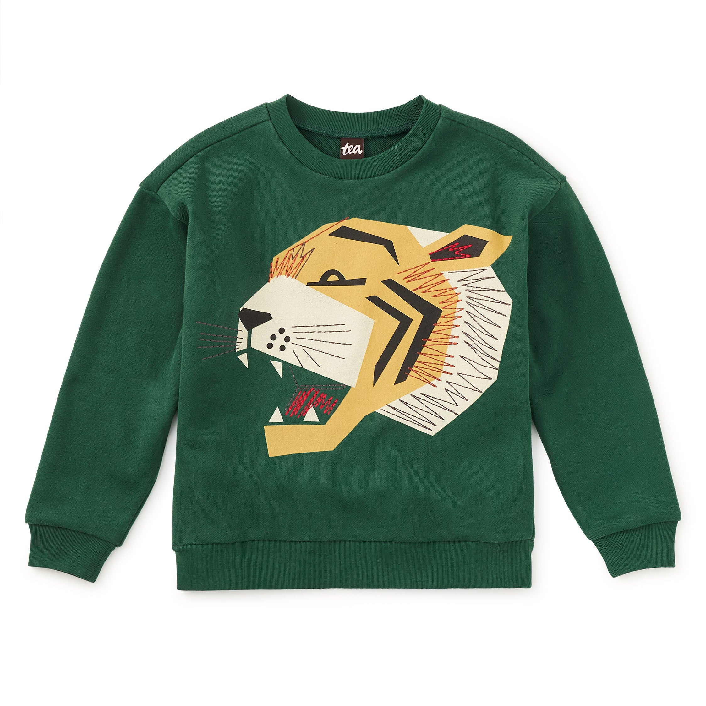 Roar into cozy season with this bold and fearless layer! Featuring a striking geometric tiger graphic with intricate embroidered details, this popover adds a fierce touch to everyday outfitting. Made from soft French terry for warmth and comfort, it's perfect for school days or weekend adventures.