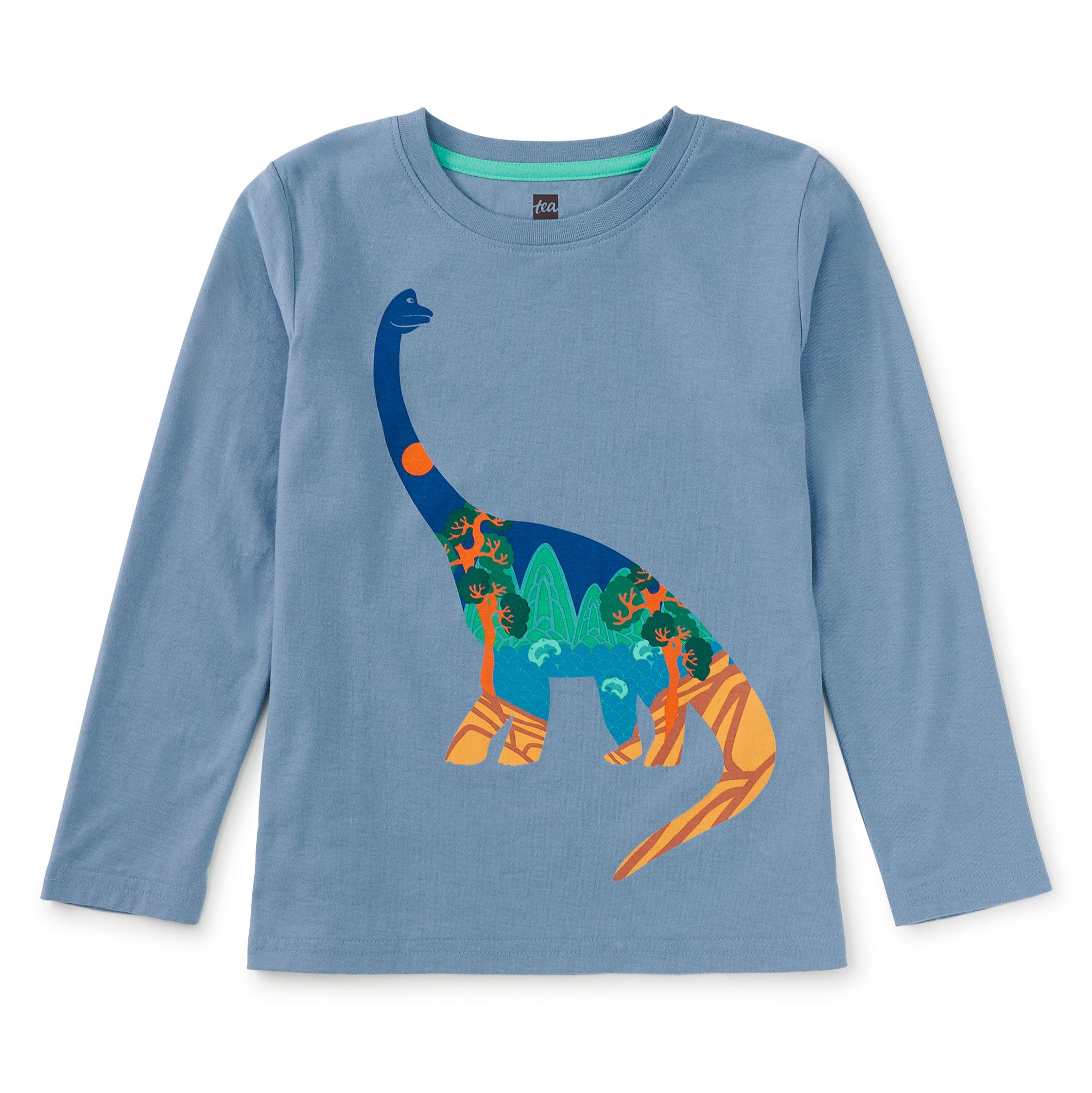 A prehistoric favorite meets timeless tradition. This dynamic graphic tee features a long-necked dinosaur filled with a vibrant landscape inspired by minhwa, a traditional form of Korean folk painting. Look closely and you'll spot rolling mountains, flourishing trees, and serene waters all iconic symbols in minhwa art meant to celebrate harmony, luck, and nature's beauty.