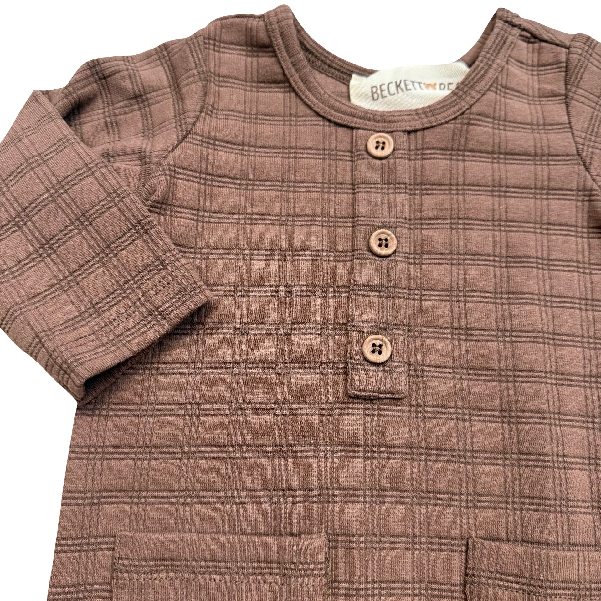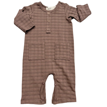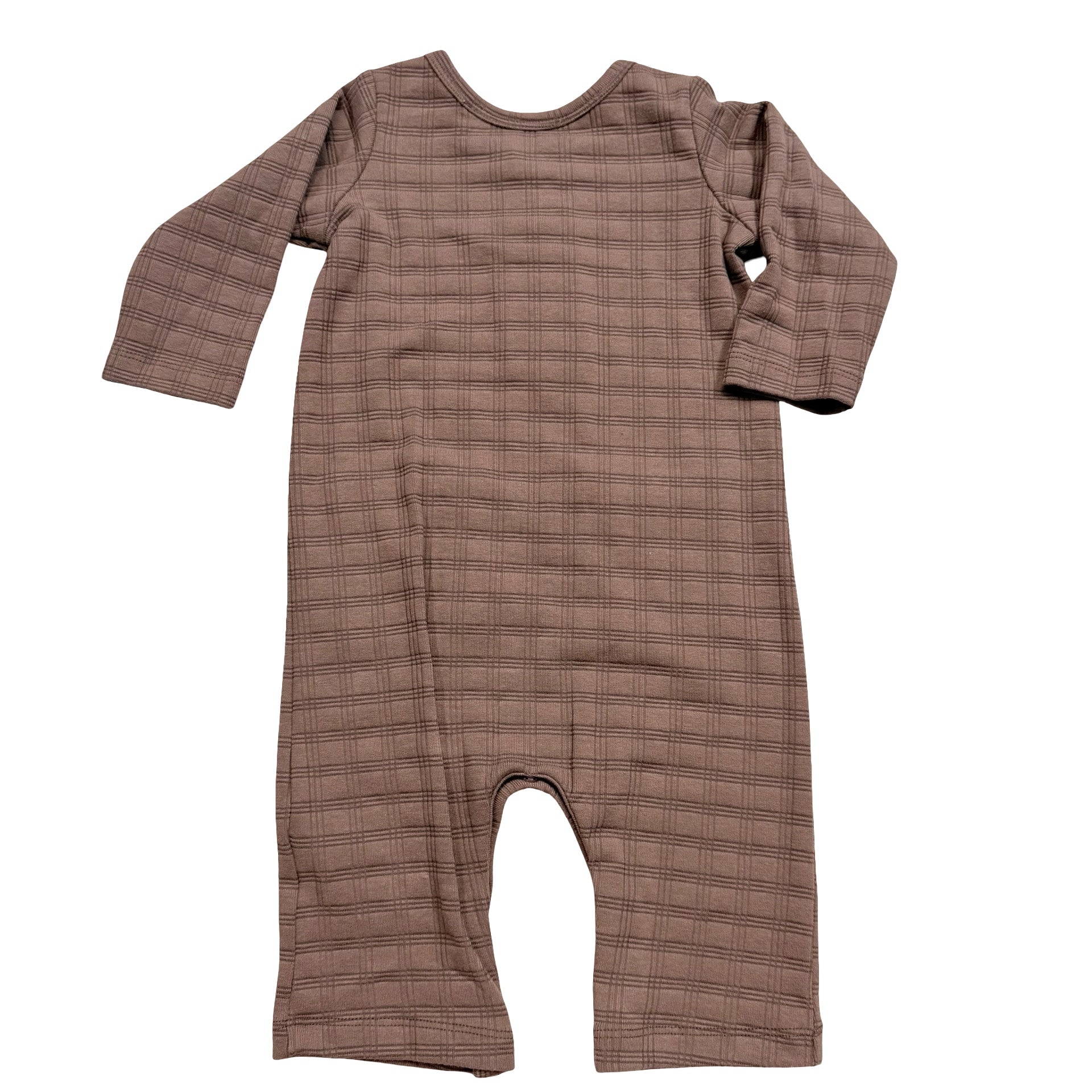 Brown is IN! And your little guy will be looking so handsome and trendy in this little romper! This is lightweight and cozy, and the subtle textured pattern is so fun!