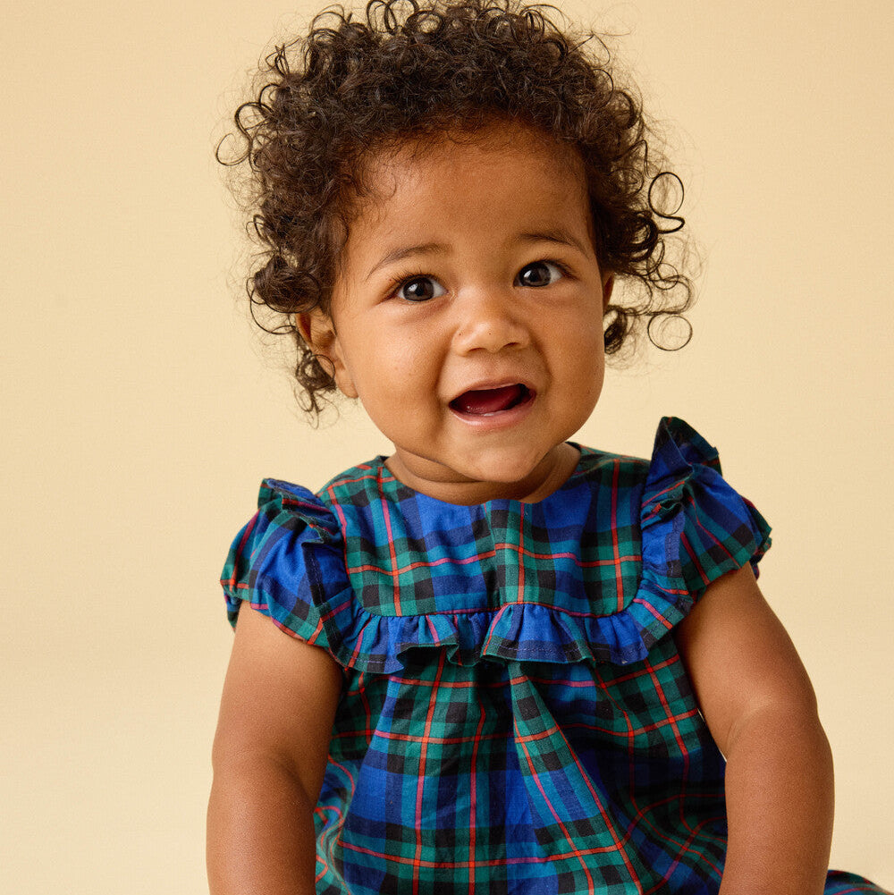Festive plaid meets sweet ruffle details in this heirloom-worthy romper. Designed in our seasonal Busan Holiday Plaid, it's perfect for baby's first celebrations and picture-ready moments with the whole crew. Soft cotton poplin and snaps at the inseam make changes easy, while the timeless design ensures it becomes a keepsake piece for years to come. A thoughtful gift for expecting parents or little ones marking their first holidays.