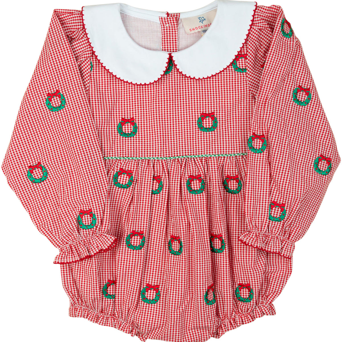 Prepare your little one for festive holiday photos with the charming Embroidered Bubble in Christmas Wreaths design. This delightful outfit features a classic Peter Pan collar, adding a timeless touch to your child's holiday look. Crafted with care, the embroidery showcases beautiful wreath details that capture the spirit of Christmas. Comfortable and stylish, this bubble romper is perfect for creating memorable Santa pictures and family celebrations. Make this season extra special with an outfit that combines festive elegance and cozy wearability, ensuring your child looks irresistible for every holiday moment.