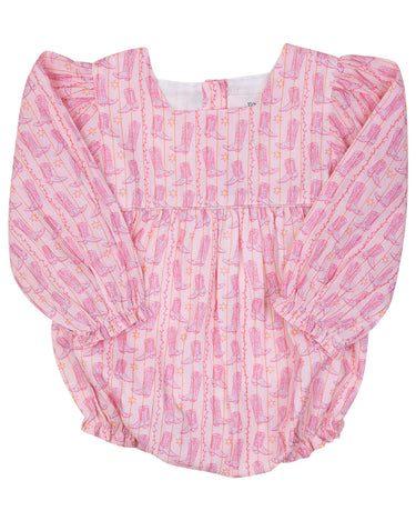 Let your little one shine in this adorable Cowgirl Boots Bubble with Gold Lurex! Designed for comfort and style, this one-piece features a playful western boot print, delicate gold lurex threading, and charming ruffle details at the sleeves and legs. Perfect for rodeo-ready cuteness, holiday photos, or everyday adventures with a touch of sparkle!